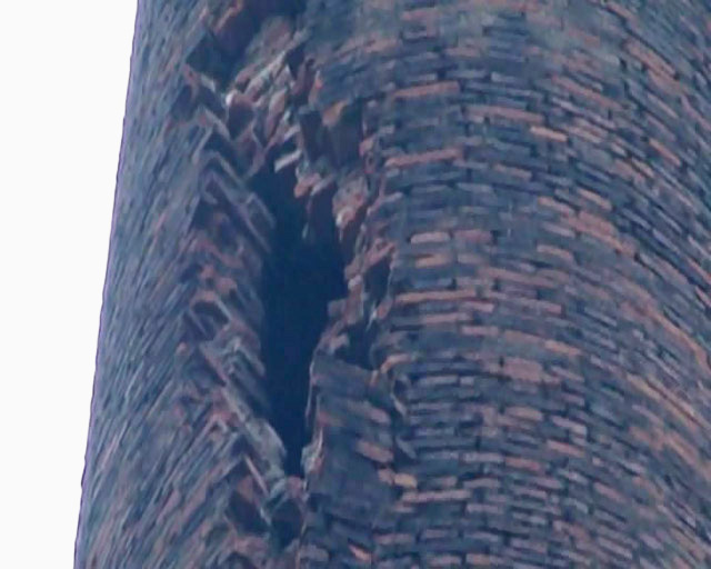 该烟囱位于富阳市新登镇银泰机械铸造厂区内,系原砖瓦厂取缔后遗留,一直未妥善处理。今年3月初因遭雷击后烟囱出现了巨大的纵向裂缝,随时有倒塌危险。该烟囱距北侧厂房仅0.2米,距东侧厂房约8米,给铸造厂安全生产带来极大安全隐患,3月9日厂区因此全面停产。