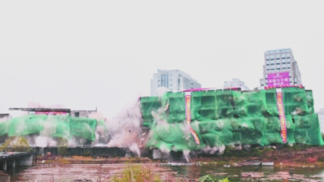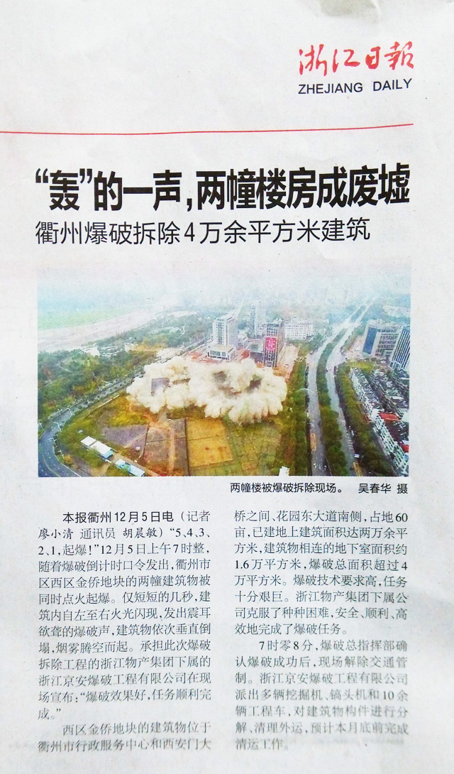 “5、4、3、2、1,起爆!”12月5日上午7时整,随着爆破倒计时口令发出,衢州市区西区金侨地块的两幢建筑物被同时点火起爆。仅短短的几秒,建筑内自南至北火光闪现,发出一阵阵连续清脆的爆破声,建筑物依次垂直倒塌,烟雾腾空而起。承担此次爆破拆除工程的浙江物产集团下属的ky在线官网在现场宣布:“爆破效果良好,任务顺利完成!”